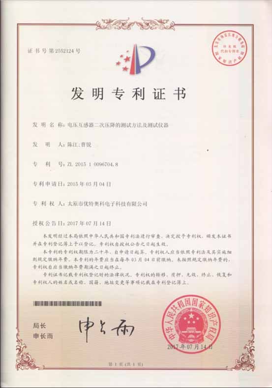 我公司獲得“電壓互感器二次壓降的測(cè)試方法及測(cè)試儀器”的發(fā)明專利授權(quán)。