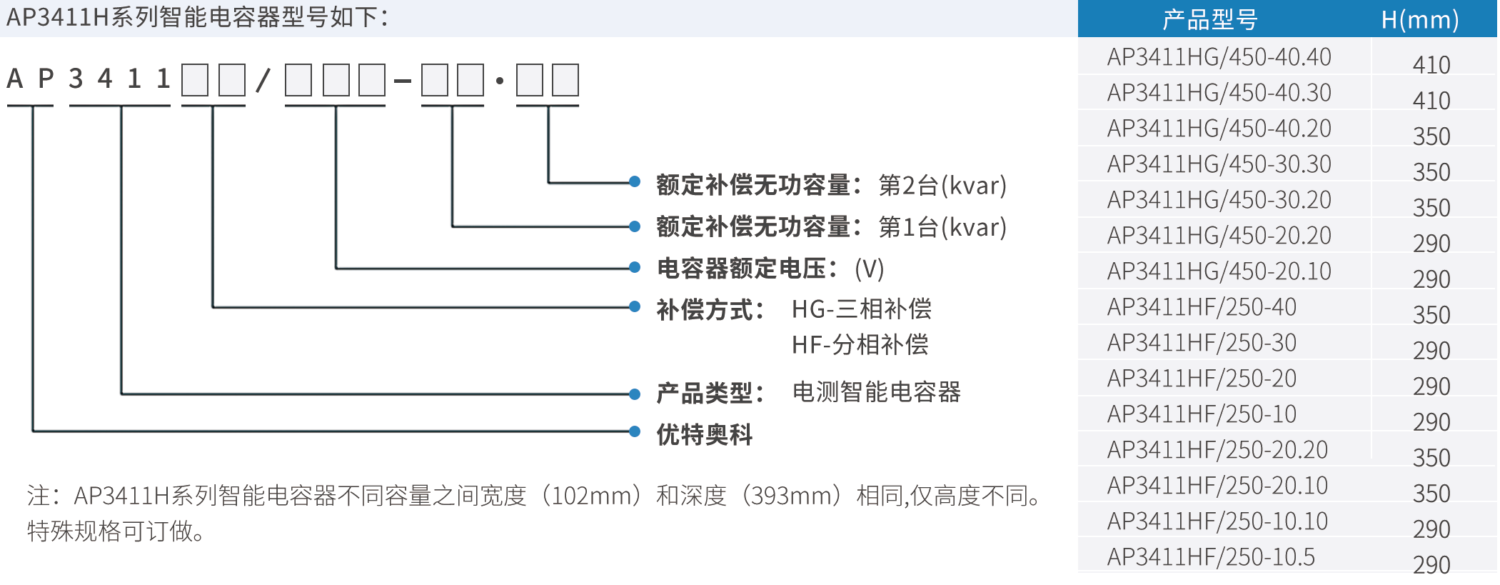 AP3411C系列智能電容器是由智能測控單元、同步零投切開關(guān)、智能保護(hù)單元、組網(wǎng)單元、顯示單元、兩臺(tái)(△型)或一臺(tái)(Y型)低壓自愈式電力電容器組成一個(gè)獨(dú)立完整的智能無功補(bǔ)償系統(tǒng)。產(chǎn)品既可單臺(tái)使用,也可多臺(tái)組網(wǎng)構(gòu)成補(bǔ)償系統(tǒng)使用;既可配套AP系列低壓無功綜合測控儀使用,也可使用二次電流互感器直接構(gòu)成補(bǔ)償系統(tǒng)使用;既可三相補(bǔ)償,也可三相和分相混合補(bǔ)償。AP3411C系列智能電容器應(yīng)用于電網(wǎng)諧波含量較低的低壓電力系統(tǒng)中,可靠運(yùn)行,提高系統(tǒng)功率因數(shù),降低線損,提高電網(wǎng)電能質(zhì)量。 AP3411H系列智能電容器,除具備AP411C系列產(chǎn)品的所有功能外,還可以實(shí)現(xiàn)更大補(bǔ)償容量(40+40)Kvar,更大分?jǐn)嗄芰Γú捎盟軞嗦菲鳎㊣cu≥20KA。 AP3411HB系列混補(bǔ)型智能電容器是由智能測控單元、零投切開關(guān)、智能保護(hù)單元、一臺(tái)(△型)和一臺(tái)(Y型)低壓自愈式電力電容器組成一個(gè)獨(dú)立完整的智能補(bǔ)償單元,替代由智能無功控制器、熔絲(或微斷)、晶閘管復(fù)合開關(guān)(或接觸器)、熱繼電器、低壓電力電容器多種分散器件組裝而成的自動(dòng)無功補(bǔ)償裝置。