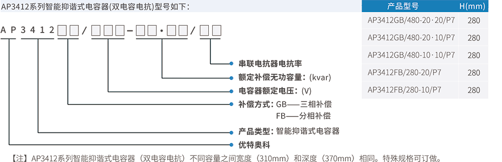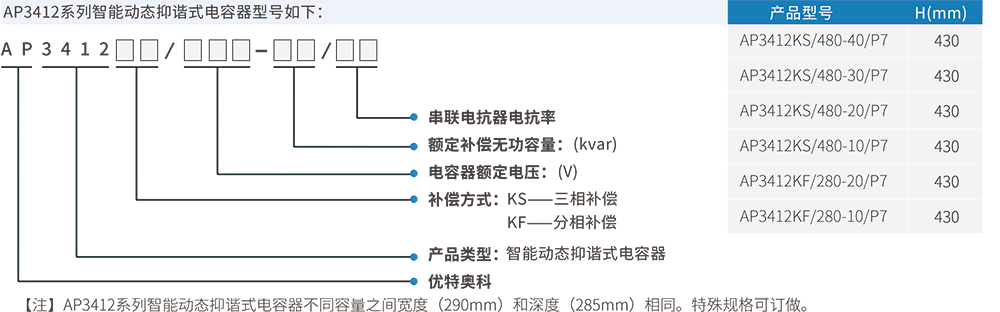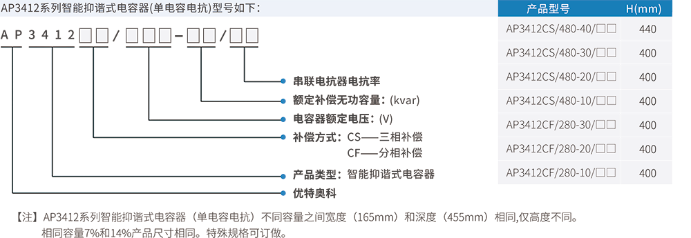 AP3412系列智能抑諧式電容器是由智能測控單元、同步零投切開關、智能保護單元、組網單元、顯示單元、一臺/兩臺(△型)或一臺(Y型)低壓自愈式電力電容器、高品質電抗器組成的智能無功補償系統(tǒng)。產品具有模塊化、標準化、免維護等特性,具有零投切、分級補償、過電流/過電壓/過溫度保護、故障自診斷、測量、通信、信號、聯(lián)機等功能。AP系列智能抑諧式電容器應用于電網諧波含量嚴重的低壓電力系統(tǒng)中,能夠安全可靠運行,不會產生諧波,對諧波無放大作用。有效的提高了系統(tǒng)功率因數(shù),降低線損,提高電網電能質量。 AP3412系列智能動態(tài)抑諧式電容器是由智能測控單元、大功率晶閘管投切開關、智能保護單元、組網單元、顯示單元、低壓自愈式電力電容器、高品質電抗器、放電及風冷單元組成的智能無功補償系統(tǒng)。產品具有模塊化、標準化、免維護等特性,具有快速零投切、分級補償、過電流 / 過電壓 / 過溫度保護、故障自診斷、測量、通信、信號、聯(lián)機等功能。